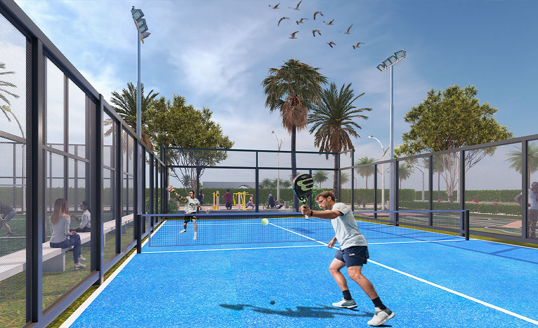 Urbanismo inspirado en el Mediterráneo, con fachadas blancas, techos azules y senderos peatonales que invitan a caminar y convivir.